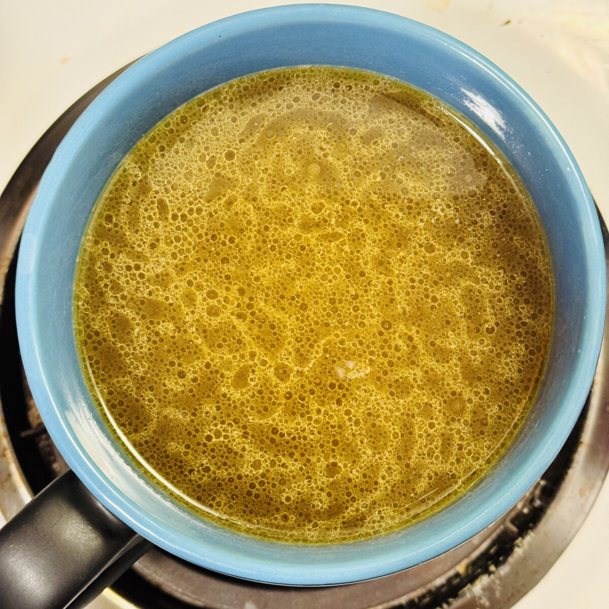 Here’s some rich homemade bone broth in my pot with butter heating up for my morning dose.