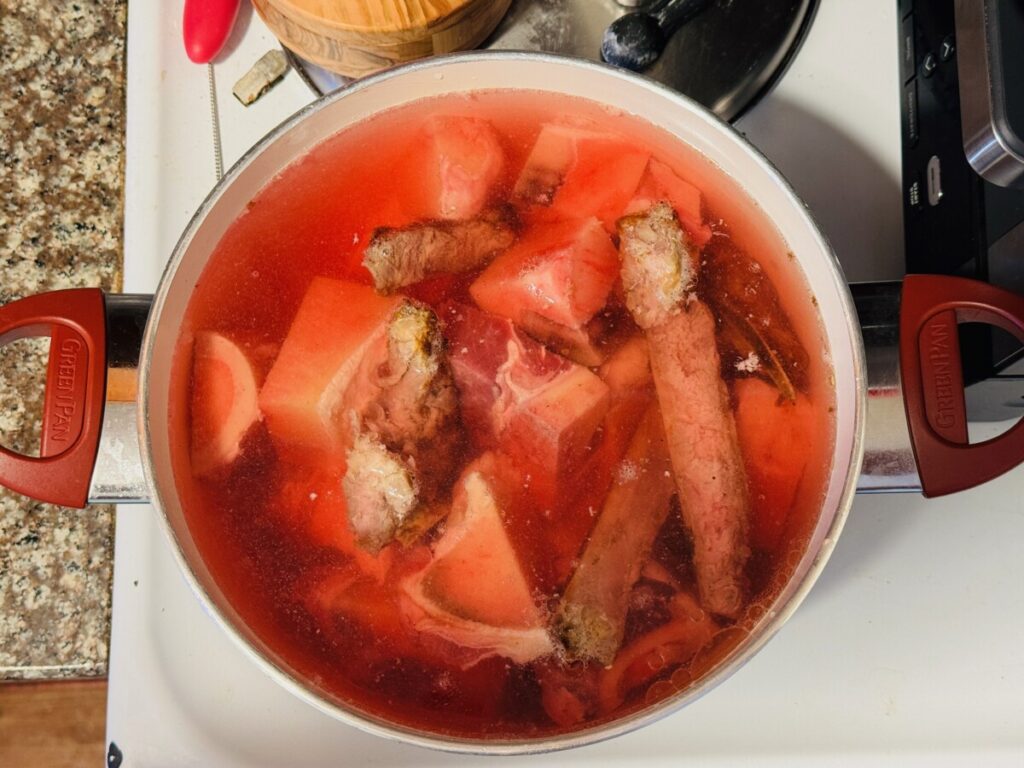 After bringing this to a boil, I let it simmer for a few minutes to draw out the impurities, and sure enough, it created a pretty ugly scum. That draws out everything you don’t want in your broth, which can taint the flavor. I didn’t cook it for too long though, as I wanted to be sure I kept all the tallow I could.