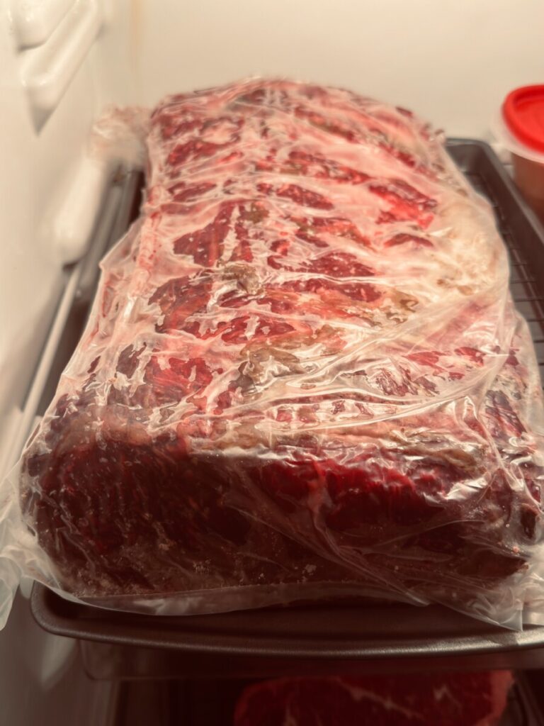 As mentioned, I’m home dry aging a strip loin in my fridge using UMAI Dry Age bags. The color of the meat has changed in just the past couple of days.