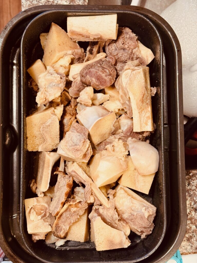 After that step, I put all the bones in my Ninja Air Crisper on the roast setting for about twenty-five minutes. I wanted to get them to a golden brown. As I’m still foggy with COVID-19, I didn’t get more images of all this.