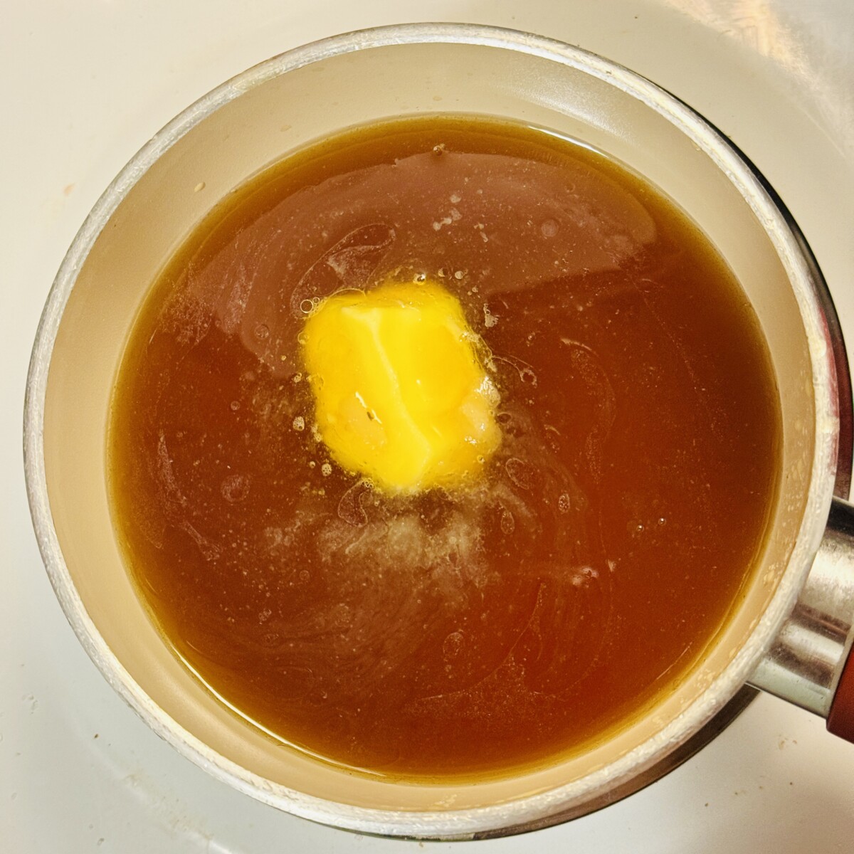 Here’s some rich homemade bone broth in my pot with butter heating up for my morning dose.
